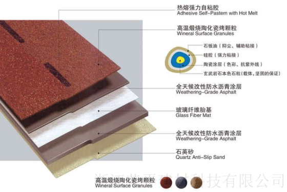 ¡¤²ÊÉ«¡¢´É¿¾¿ÅÁ£--- ±£»¤Á¤Çà±í²ãÃâÊÜÑô¹âÖ±É䣬ʹÁ¤Ç಻Ò×ÀÏ»¯£¬²»ÊÜ·çÓêÇÖÊ´£¬²¢·á¸»²úÆ·µÄÉ«²Ê£¬ÔöÇ¿ÎÝÃæµÄÃÀ¹Û£¬¶øÇÒÌṩÁ¼ºÃµÄ·À»ðÐÔÄÜ¡£ ¡¤È«Ììºò¸ÄÐÔ·ÀË®Á¤ÇàÍ¿²ã--- ÄÜʹ¶à²Ê²£ÏËÍß³¤Ê±¼äµØµÖÓù·çÓêÇÖÊ´£¬±£»¤ÎÝÃæ²»Êܳ±ÊªÓ°Ï죬²¢ÔÚÑϺ®¿áÊîÖÐÒ²Äܱ£³Ö²úÆ·ÐÔÄÜ¡£ ¡¤²£Á§ÏËά̥»ù---²»½öʹ²úÆ·¾ßÓгöÉ«µÄ·ÀË®ÐÔÄÜ£¬¼´Ê¹ÍßÃæÔâµ½ÆÆ»µ£¬¶à²Ê²£ÏËÍßÒ²Äܱ£³Ö·ÀË®ÐÔÄÜ£¬¶øÇÒʹÄͺòÄÜÁ¦ºÍ·À»ðÐÔÄܵõ½×î´óÓÅ»¯£¬Áî²úÆ·¸ü¼Ó¼áÈÍÄÍÓã¬ÒÔ¼õÇá²úÆ·ÔÚÉú²ú£¬ÔËÊ䣬ʩ¹¤ºÍʹÓÃʱ·¢ÉúµÄË𻵡£ ¡¤ÈÈÈÛ×Ô𤽺---ÓöÈÈ×Ô¶¯¼¤»î£¬Ê¹¶à²Ê²£ÏËÍߺÍÏÂÒ»²ãµÄ¶à²Ê²£ÏËÍßÀι̵ØÕ³½áÔÚÒ»Æð£¬Á¬³ÉÒ»Ì壬±£Ö¤ÁËÎÝÃæµÄÕûÌåÐÔ£¬Ãܲ»Í¸Ë®¡£